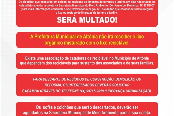 Calendário de Coleta de Galhos e Entulhos, Lixo Orgânico e Lixo Reciclável